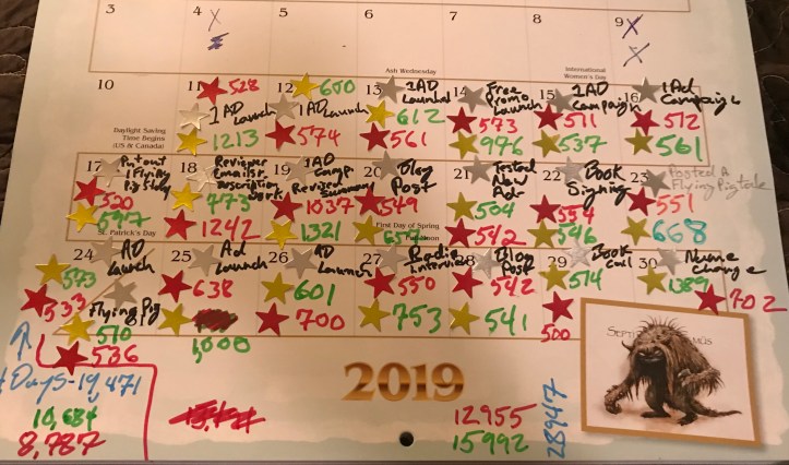 More recently, I have taken a more disciplined approach that I learned from a Jerry Seinfeld quote. Seinfeld said that he was successful because he spent time every day writing jokes. He had a calendar where he marked an “x” on every day where he spent a certain amount of time writing. He discovered that the more consecutive days he marked, the harder it was to skip days. Running a streak of 30 or 40 days resulted in progress, but also motivated him to keep working because he didn’t want to break his streak. I applied this idea to exercise goals with great success last year. So, I recently decided to apply it to my writing. I have a small goal: 500 words a day on each project I’m working on (2 right now). Every day, I write my word target before I go to bed, even if it means I stay up late and get up tired the next day. I track my 2 writing goals and a third promotional goal on a calendar that hangs next to my bed. If I hit my goals, I write down how many words I wrote or what I did, and I give myself a star sticker. After 3 weeks of this practice, I had written 28,947 words. That’s roughly half a novel. It wasn’t a huge undertaking. Often, I just spent half an hour per project at different times during the day. The other crazy thing that happened was I ended up writing more than my goal most days. My average per day word count was around 670. So once I got started, I generally overshot my goal. A neat side effect of all of the writing on my two “novels in progress” was that I had ideas far more frequently and the quality of my output improved noticeably. I had been worried that I would run out of ideas, but pointing my brain at the work resulted in me coming up with new material daily. The simple discipline of daily writing time, a little every day, resulted in more progress in less time than I have experienced in any other month of writing before.
